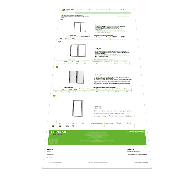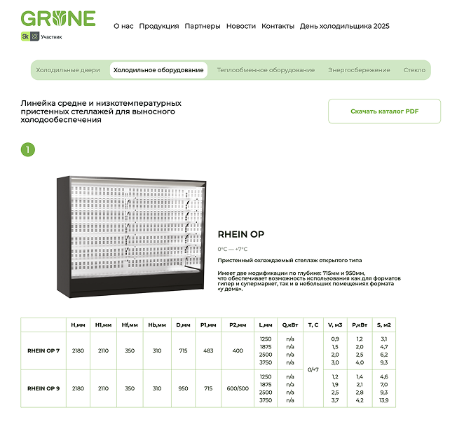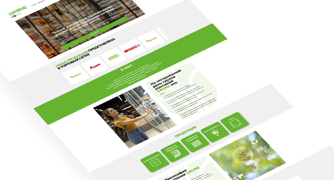 Build a corporate site for GRUNE — a manufacturer of industrial refrigeration solutions serving retail chains, engineering firms, and partners. Goal: position the company as Russia's first full cycle display door producer and leader in turnkey glazing, while structuring its product line and simplifying sales contact.